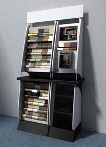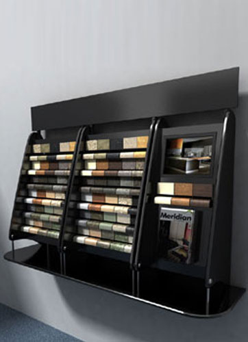 Stand Commissioned by major laminate manufacturer to display and promote their products on worktops and splash-backs. The units had to be versatile, from freestanding to wall mounted with space for brochures and video display unit with options for illumination |